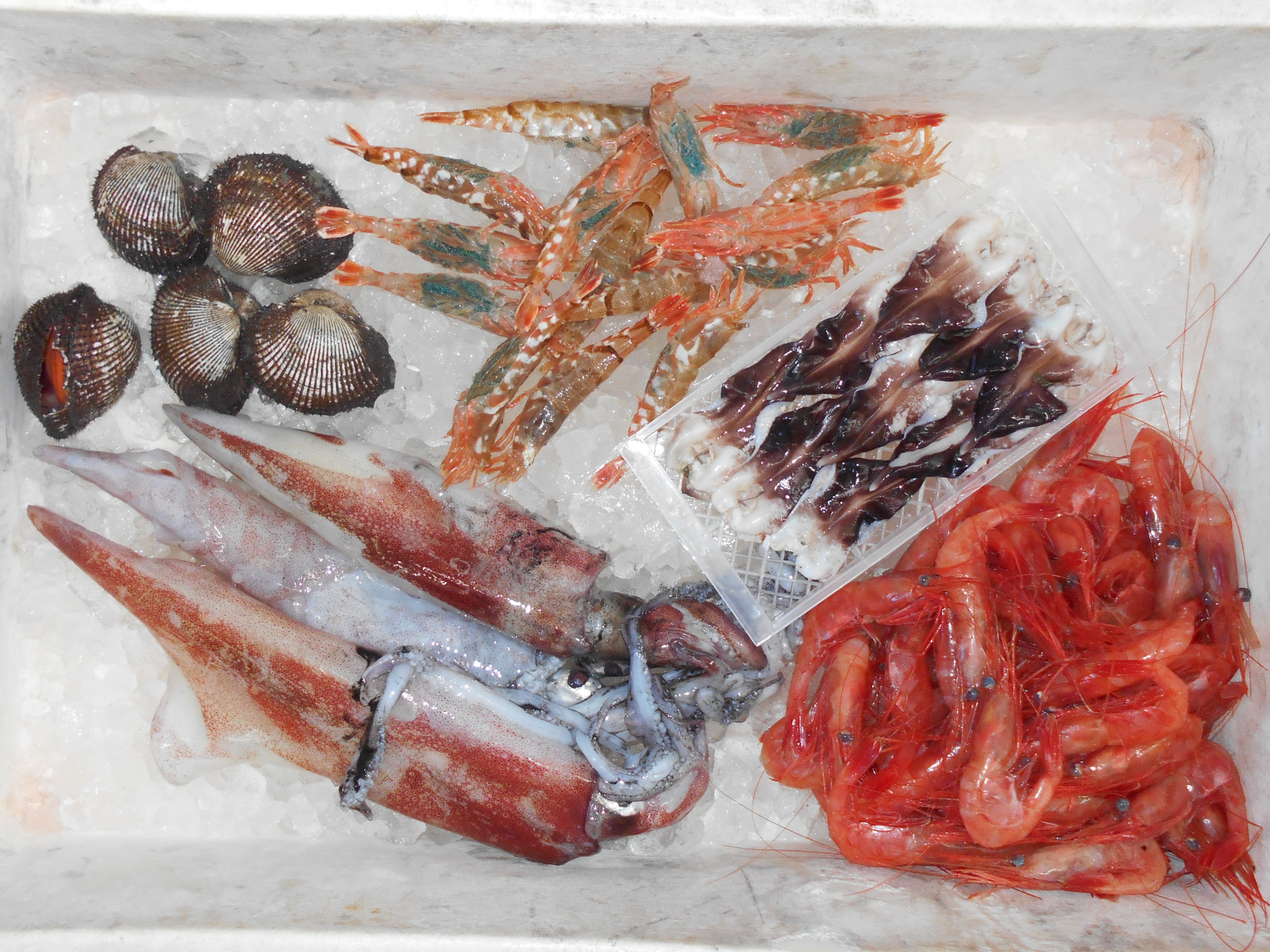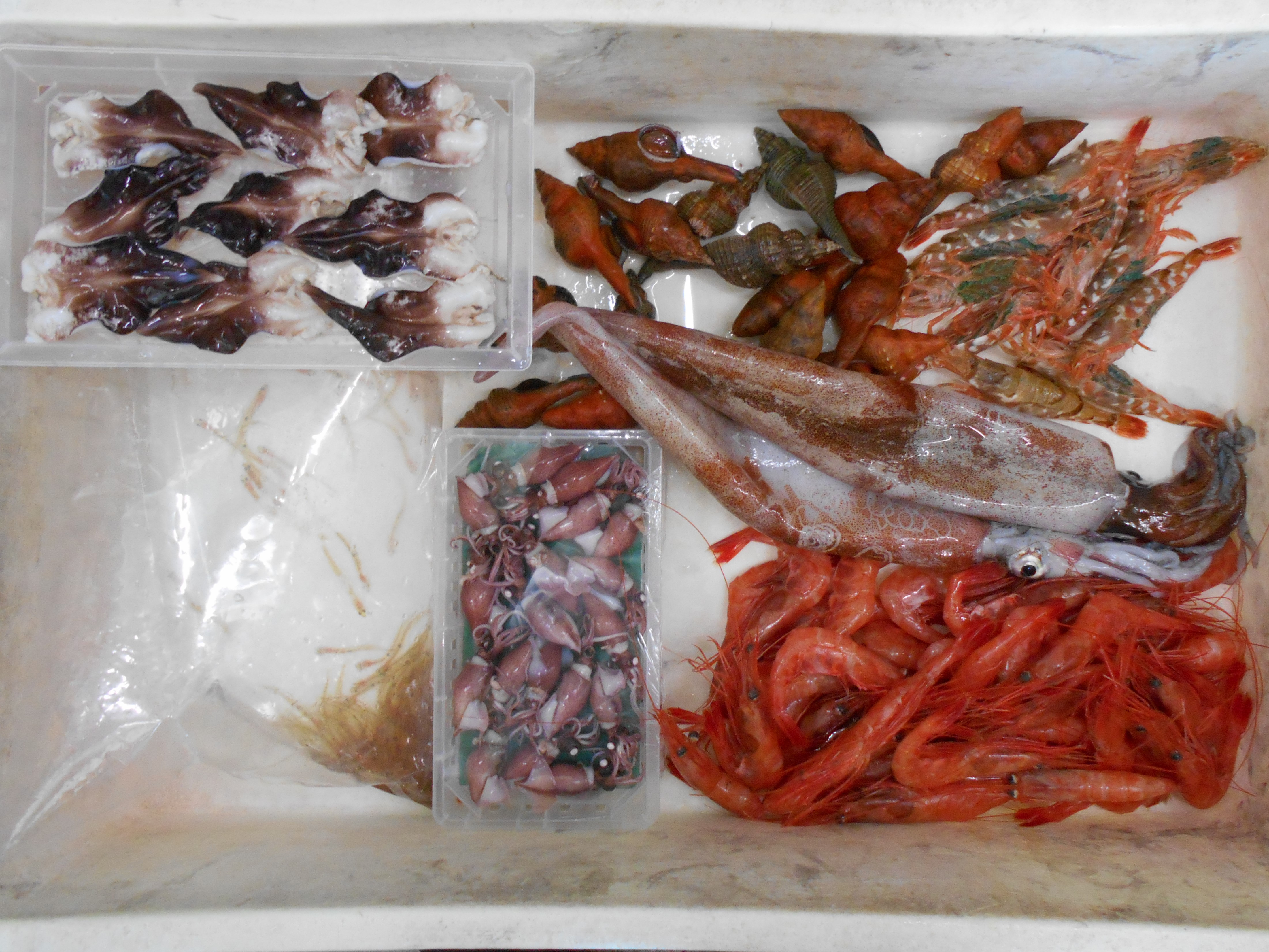 お魚はガス海老、甘海老、ヒラメ、ナメラ、アカイカ、鰤、赤貝、トリガイ、鯵、ノドグロ、カニ、車海老、サザエ、アワビ、などたくさん入荷していますよ!